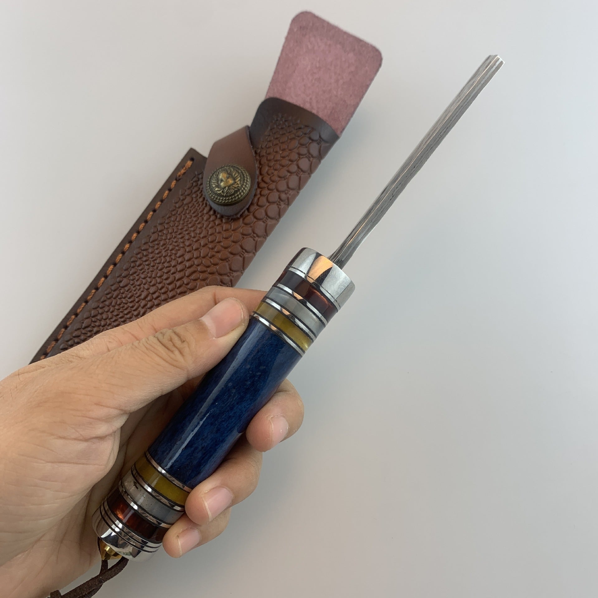 The handle is made of hand-dyed blue camel bone + resin, retaining the natural color of the resin, and matched with the brass tail vertebrae, which ensures a good feel, rich color, and full of beauty.