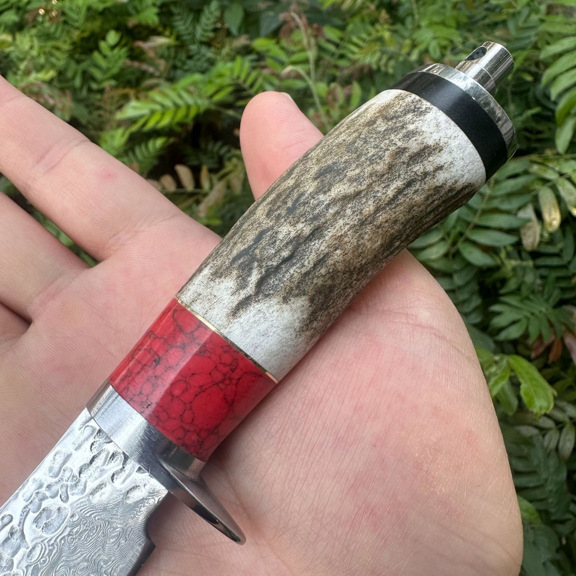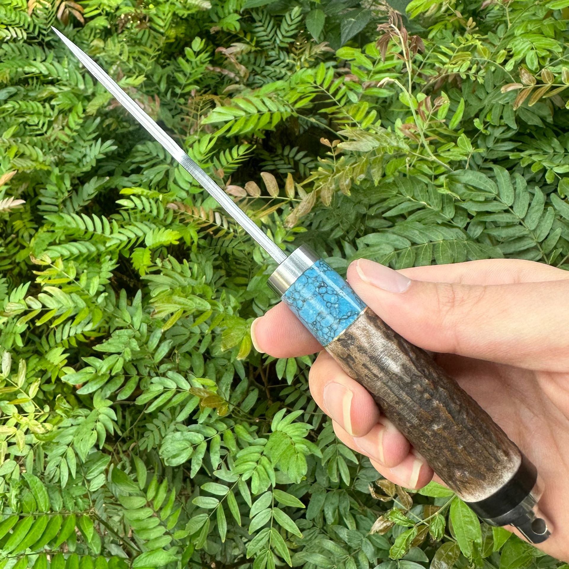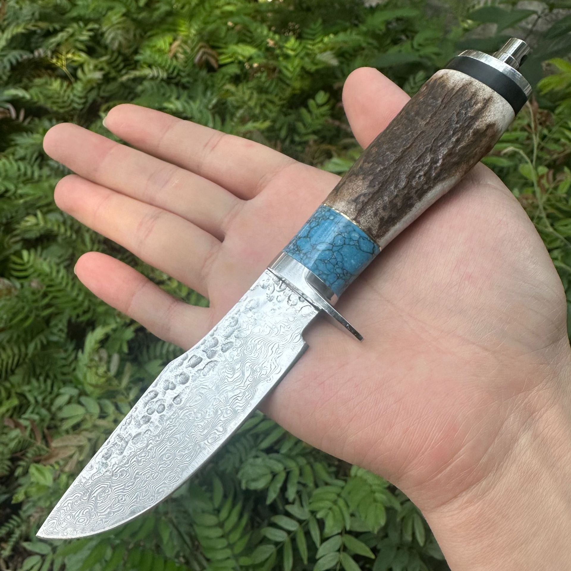 🔥Enhance your cooking game with DYLAN! Crafted from 67 layers of VG10 Damascus steel, this knife boasts a razor-sharp blade for effortless slicing, dicing, and more. The antler and turquoise handle, along with the textured leather sheath, gives DYLAN a rugged and wild vibe. Unleash your inner chef and elevate your dishes with DYLAN knives!