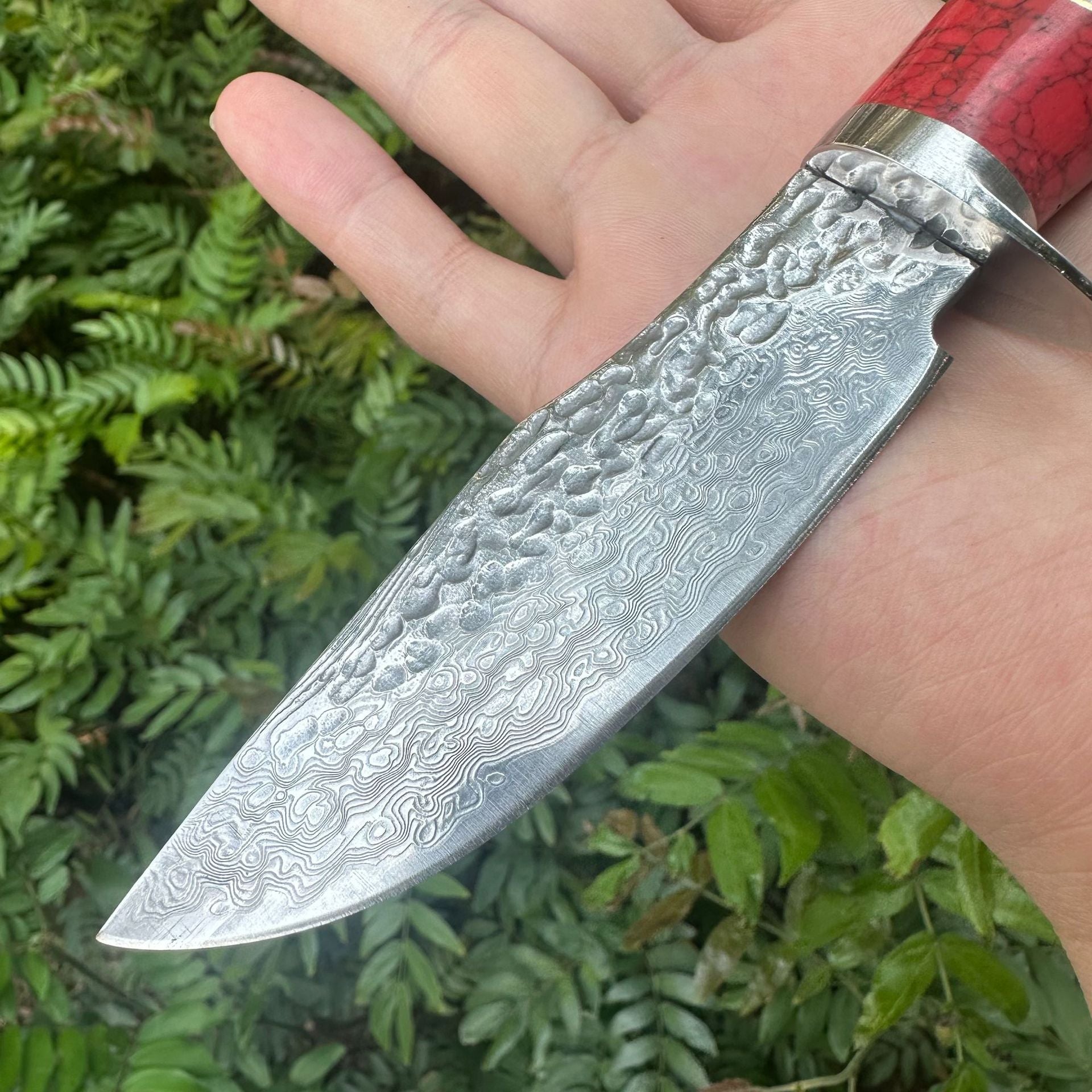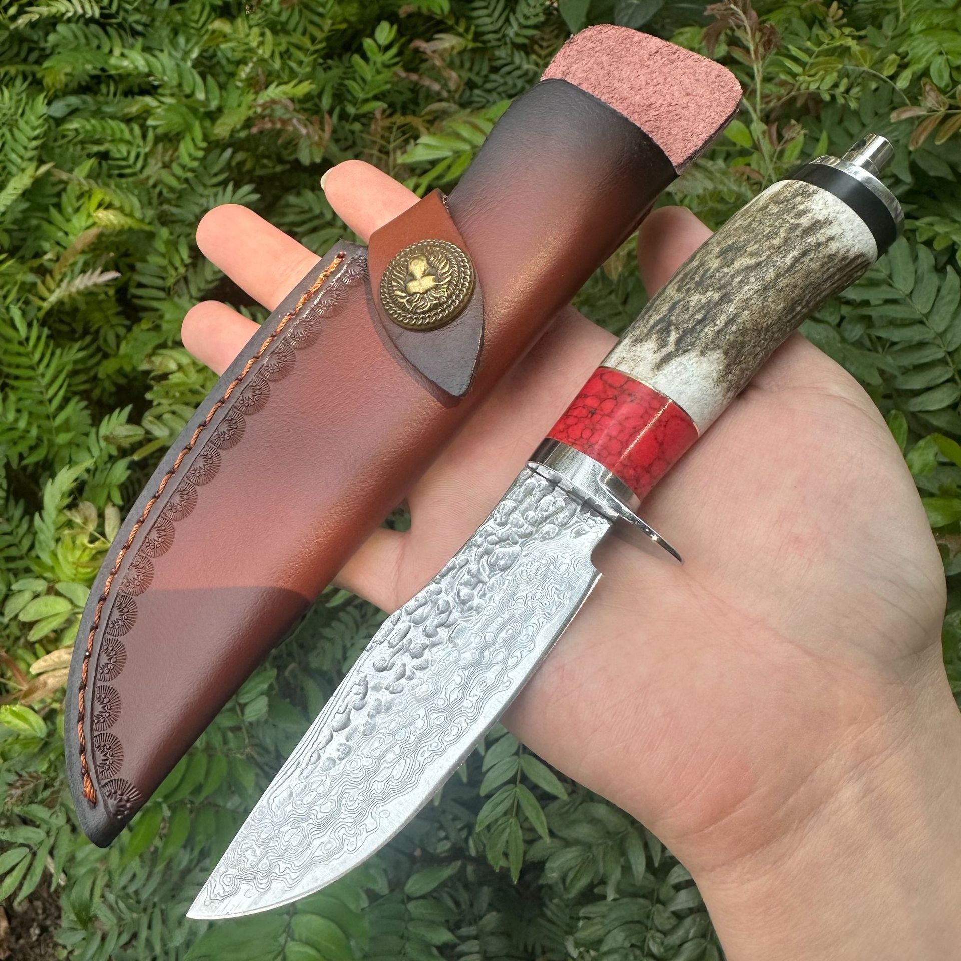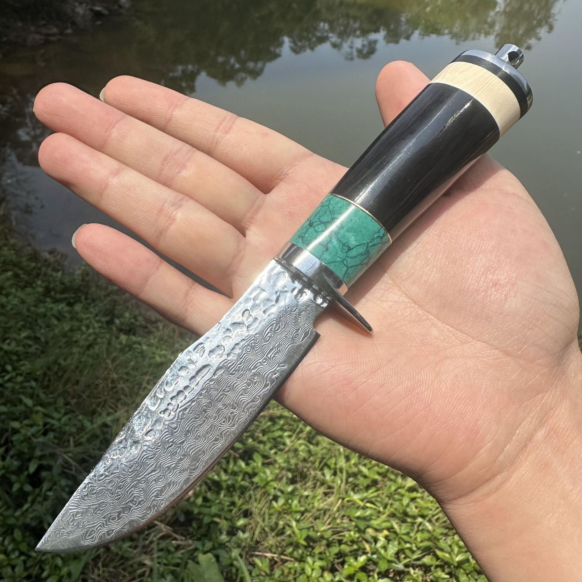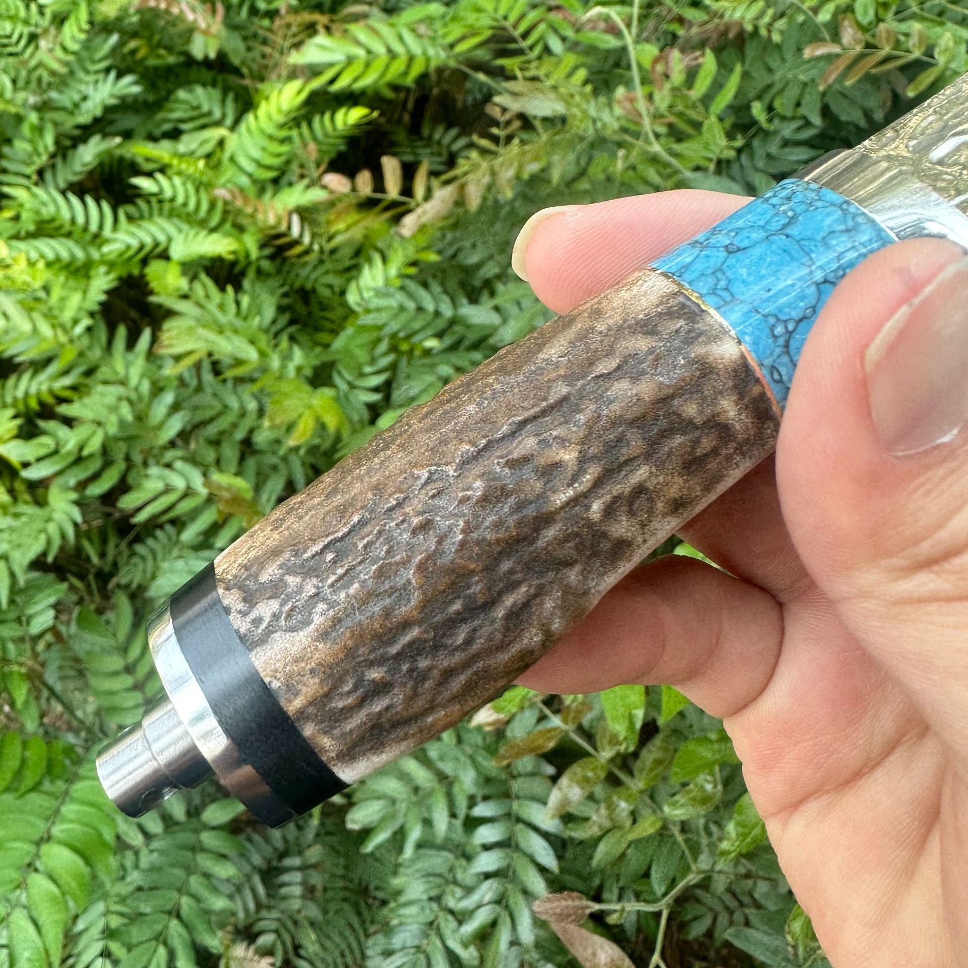🔥Enhance your cooking game with DYLAN! Crafted from 67 layers of VG10 Damascus steel, this knife boasts a razor-sharp blade for effortless slicing, dicing, and more. The antler and turquoise handle, along with the textured leather sheath, gives DYLAN a rugged and wild vibe. Unleash your inner chef and elevate your dishes with DYLAN knives!