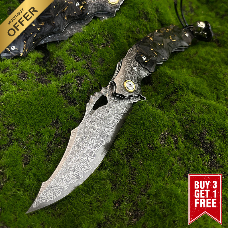 ⭐Crafted for the bold, the ELMO VG10 slices through challenges with its hand-forged Damascus laminated steel blade—razor-sharp and built to endure the wildest conditions. Feel the thrill every time you flick open the knife, thanks to its smooth bearing-spring system. The gold-tempered carbon fiberglass handle grips firmly, blending comfort with a fearless edge. Distinctive and perfectly balanced, this knife turns routine carry into an adventurous experience, made for those who dare to push boundaries and demand top-tier craftsmanship.