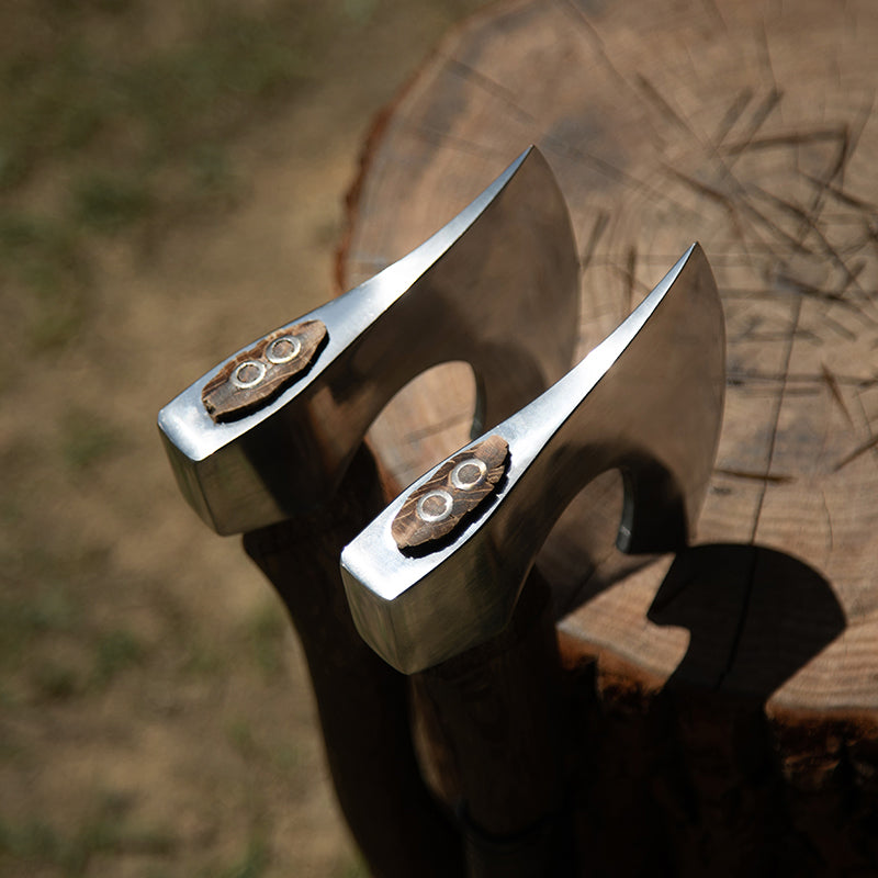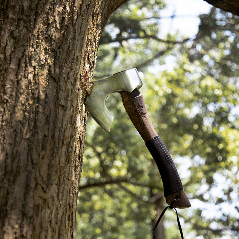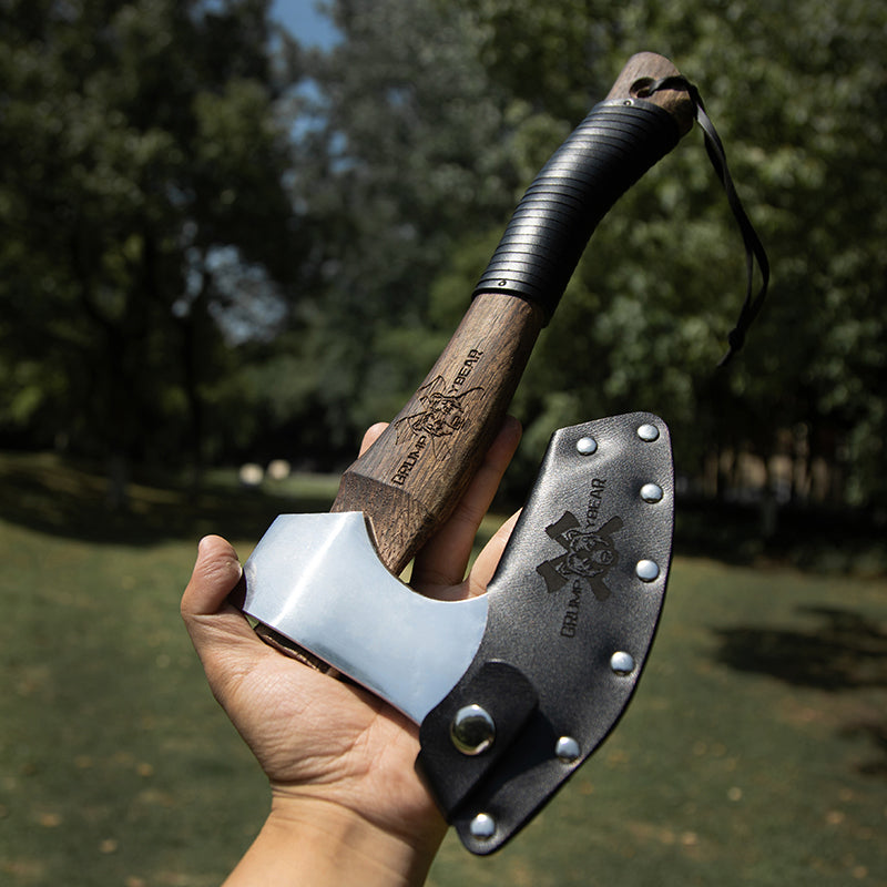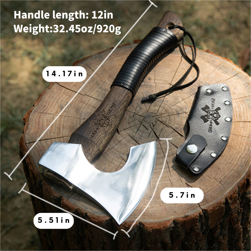 The unique aircraft head blade will bring unexpected cutting effect. It's well balanced and strong. Chopping wood and chopping bones, or slicing meat will become extremely easy. The thick blade also doubles as a hammer, a truly versatile camping tool.