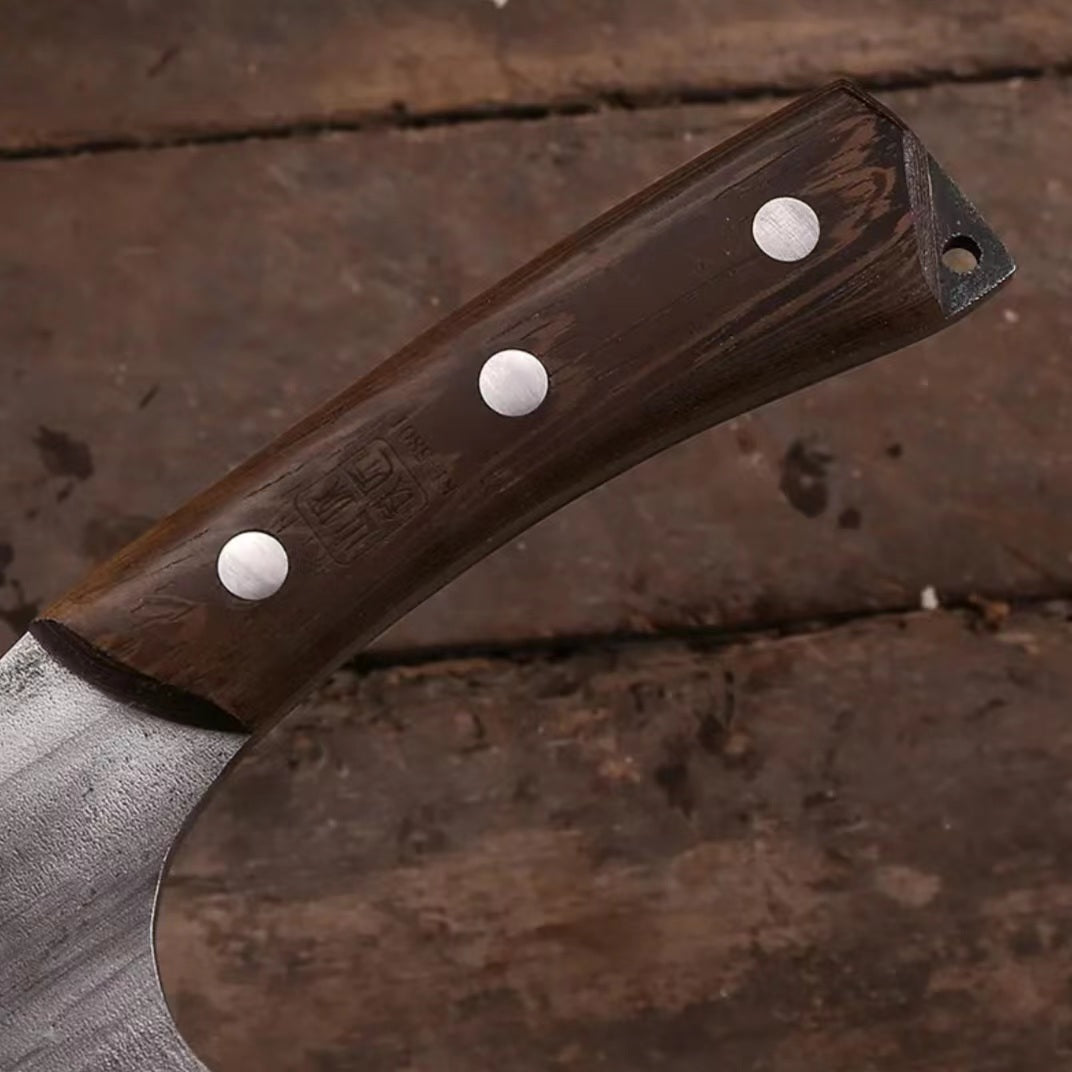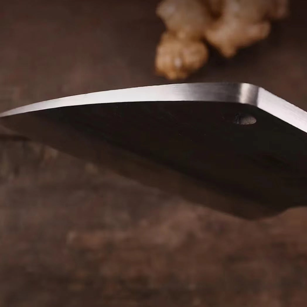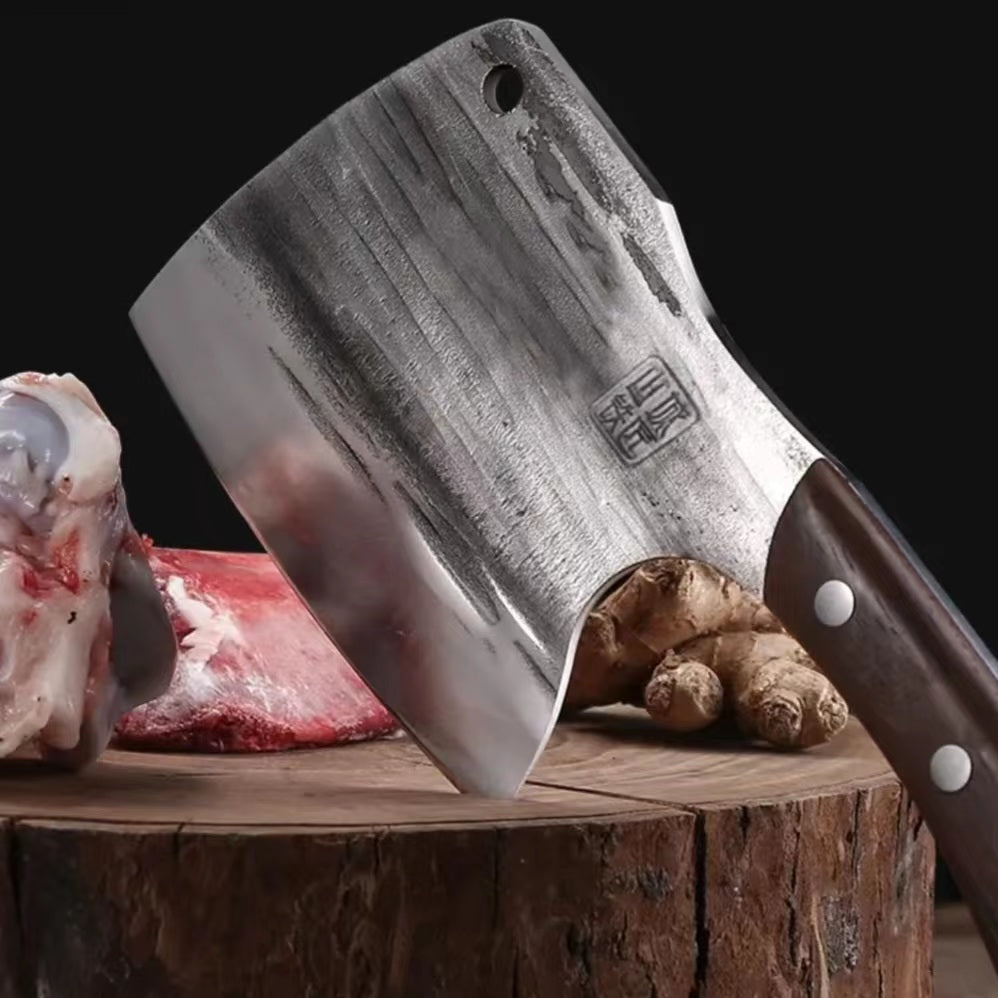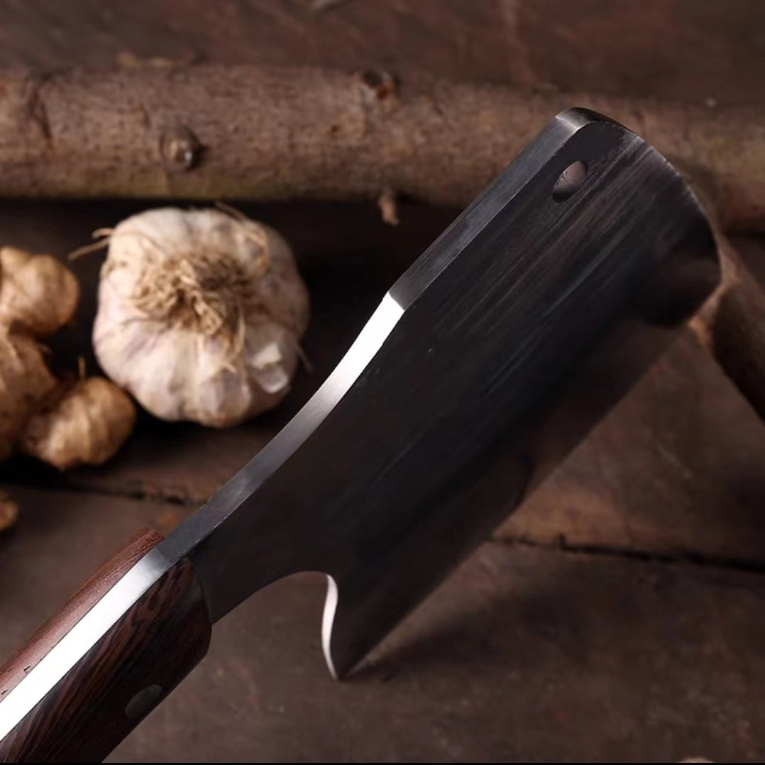 This artisan handcrafted vanadium steel AXE knife is a beast!  The razor-sharp blade is tough and aggressive.  It can hack through hard meat and bones like butter, and seamlessly chops hardy vegetables.  Simply put, this blade will glide straight through anything you throw at it.