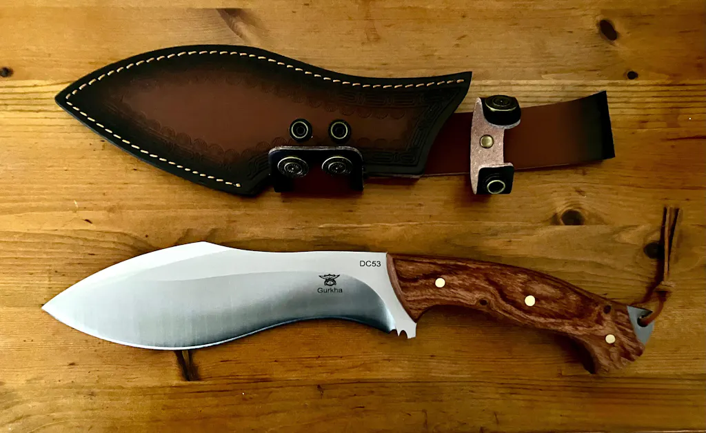 The HOBART is a heavy-duty full-tang Gurkha(kukri) machete designed for serious outdoor work. With a 10mm thick DC53 steel blade and figured wood handle, this powerhouse tackles the toughest jobs—from clearing brush and chopping firewood to processing game and building shelter.