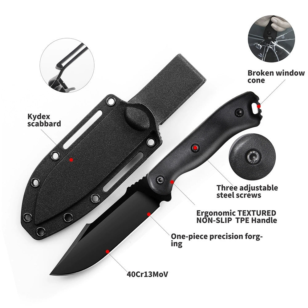 ⭐The blade is made of 40CR13MOV high-quality tool steel (58-60HRC), and the 420J2 powder black coating makes the blade gorgeous and hard, ensuring durability and performance when you need it most.