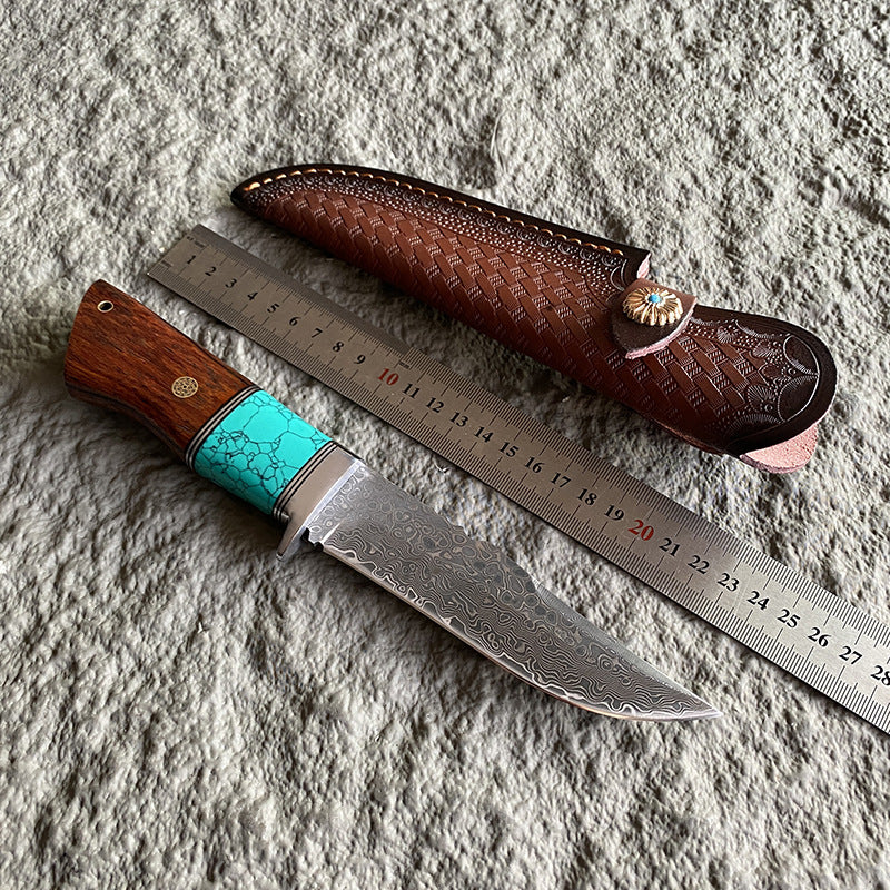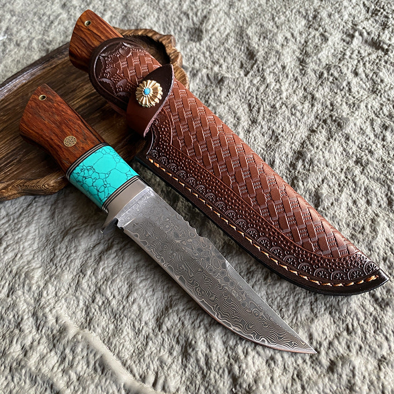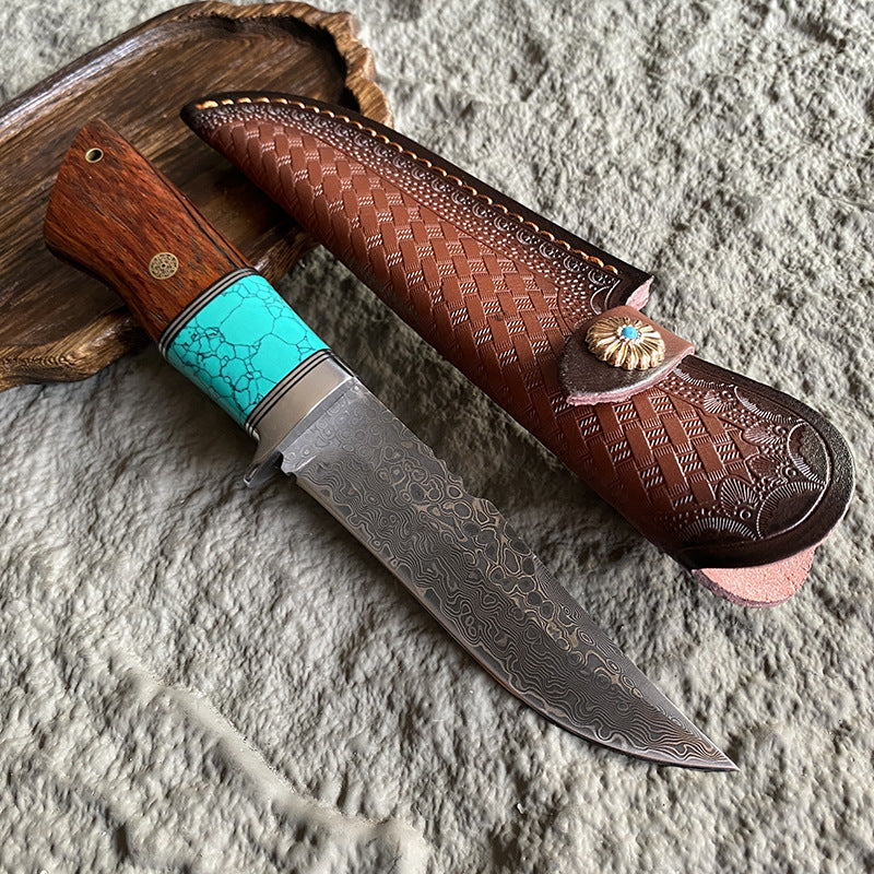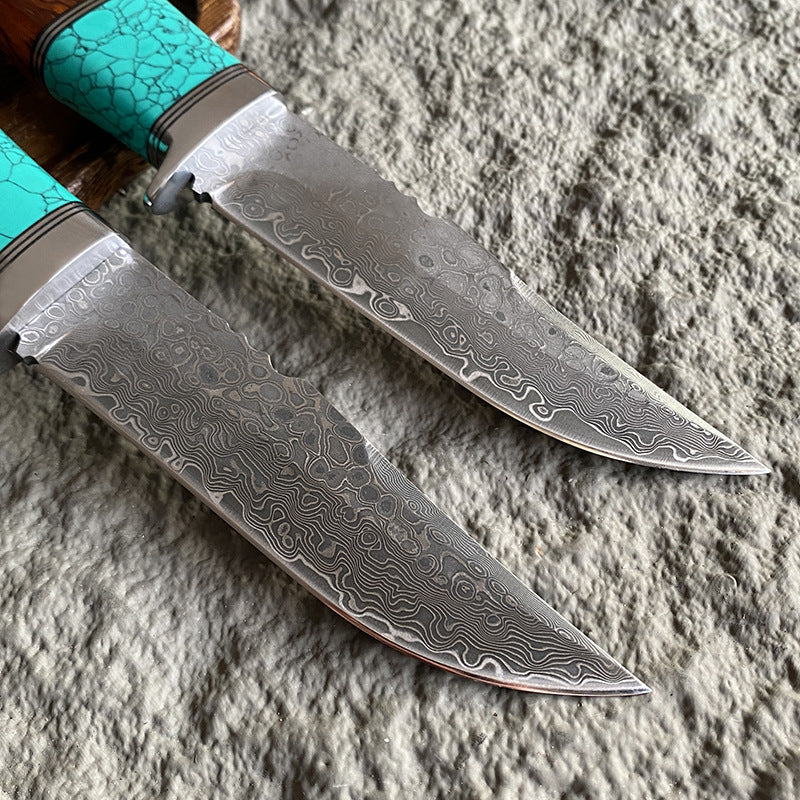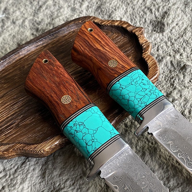 ARIES II is the perfect blend of strength and style, featuring a hand-forged VG10 Damascus steel blade with 67 layers and a stunning water ripple pattern. Its full-tang construction and 62 HRC hardness make slicing through meat and bone effortless. The natural Olneya Tesota+Turquoise Handle adds a touch of elegance, while the custom sheath ensure you’re ready for any bold adventure. Slice, dice, and explore with ARIES II by your side!