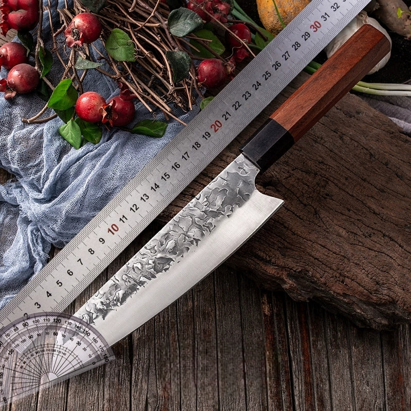 Bunka knives are one of the few multipurpose traditional Japanese blades, and can be used as a slicer or a vegetable knife. These sword shaped knives feature a straighter and wider edge than a Yanagi for vegetables, and a longer blade than an Usuba for slicing fish with ease. The user need to be more skilled with traditional Japanese knives in order to utilize this unique Bunka style design properly. Traditionally, these knives are used only by head chefs as a symbol of status.