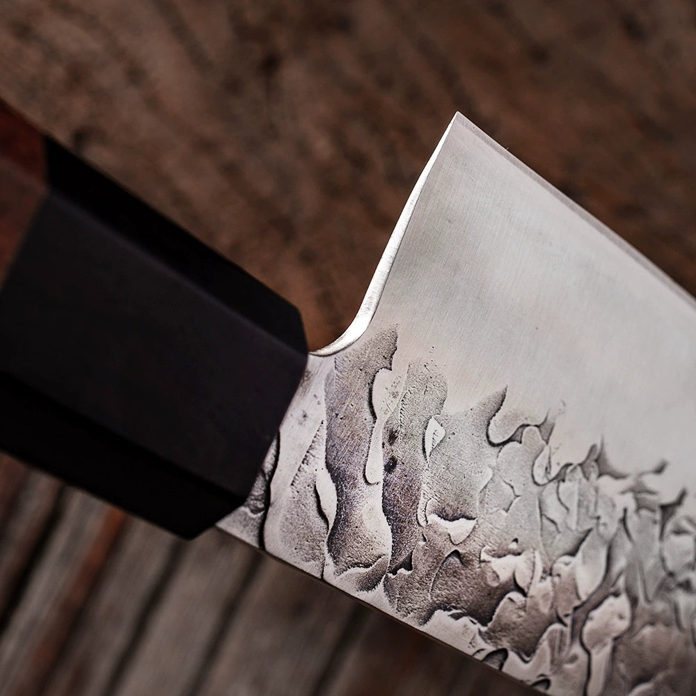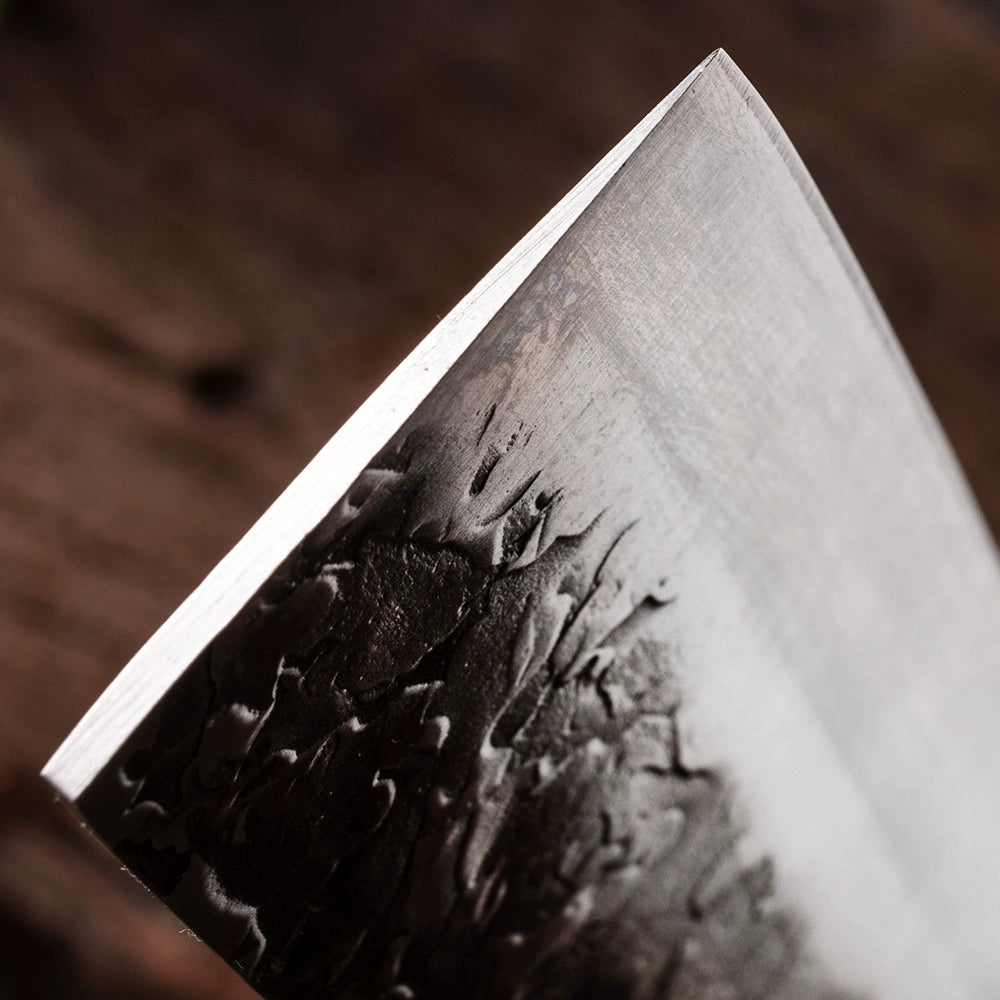 5Cr15 stainless steel is highly corrosion resistant and is hand-forged by craftsmen to provide very good edge sharpness and edge retention. The center of the blade is made of hard steel for high sharpness, and the two sides are covered with a variety of soft steel materials. The multiple steels are connected by metallurgy, not by electroplating or glue. The more the blade is forged, the more complex the corrugations are, and the more beautiful the unique texture pattern is.