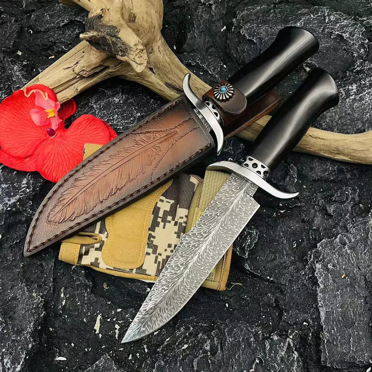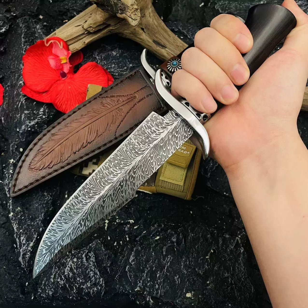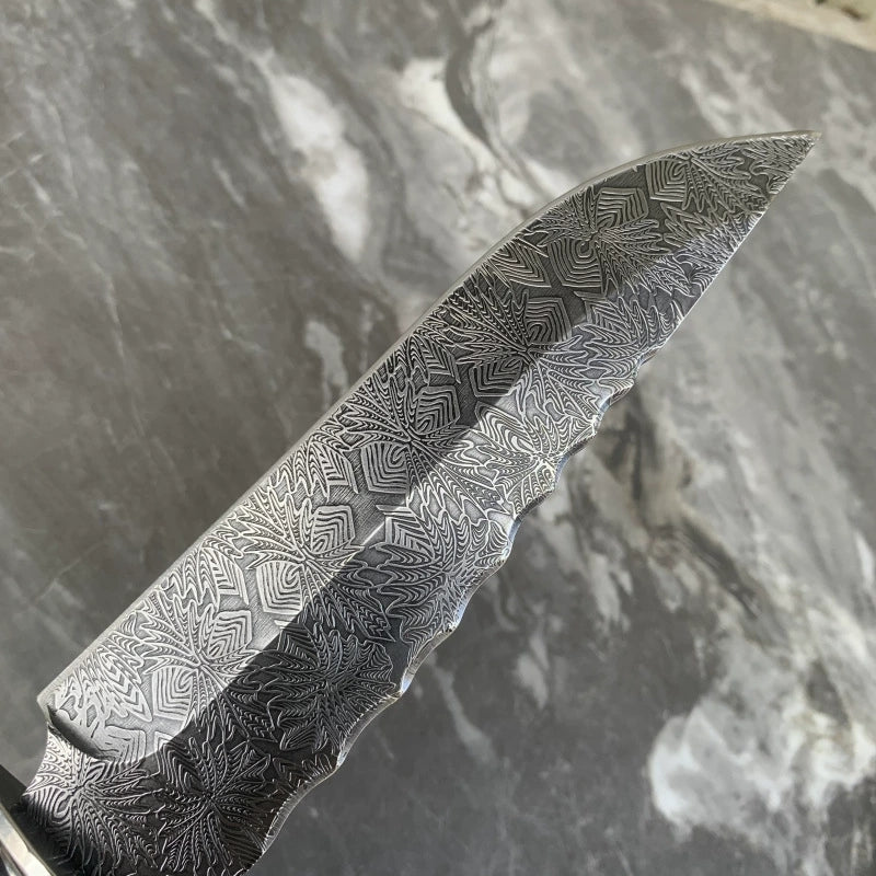 BLAIR is constructed from 9Cr15Mov stainless steel and features a unique feather pattern on the blade. Designed with an ergonomic black ebony handle and stainless steel head, this knife offers superior power and precision for all cutting and felling tasks. Complete with a high-grade, genuine cowhide sheath, it is a practical and collectible survival tool.