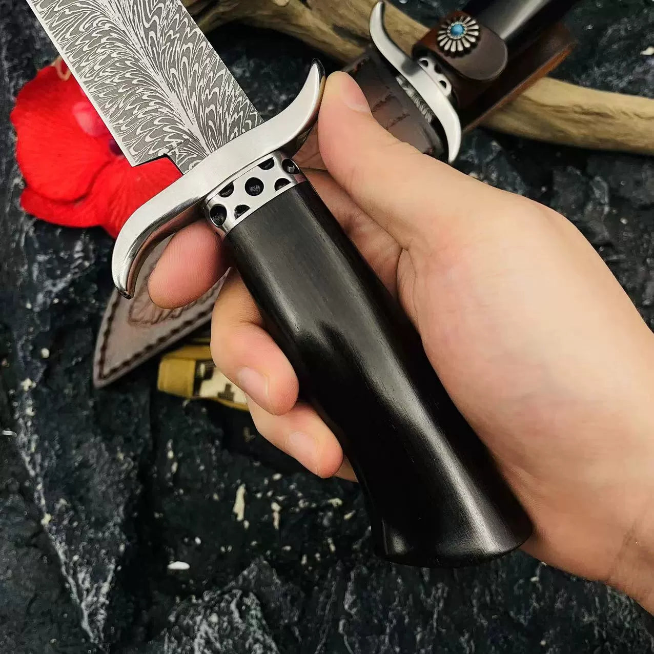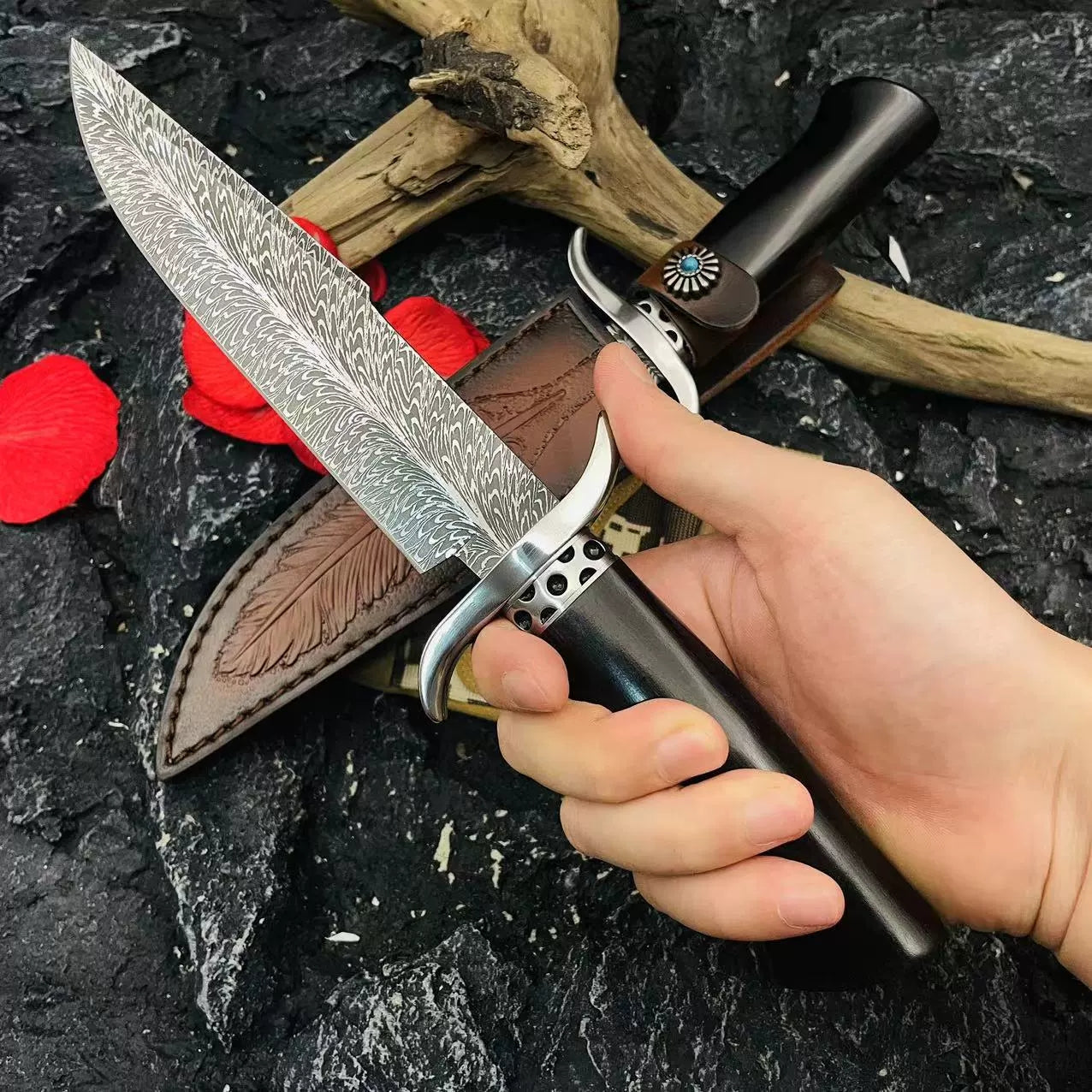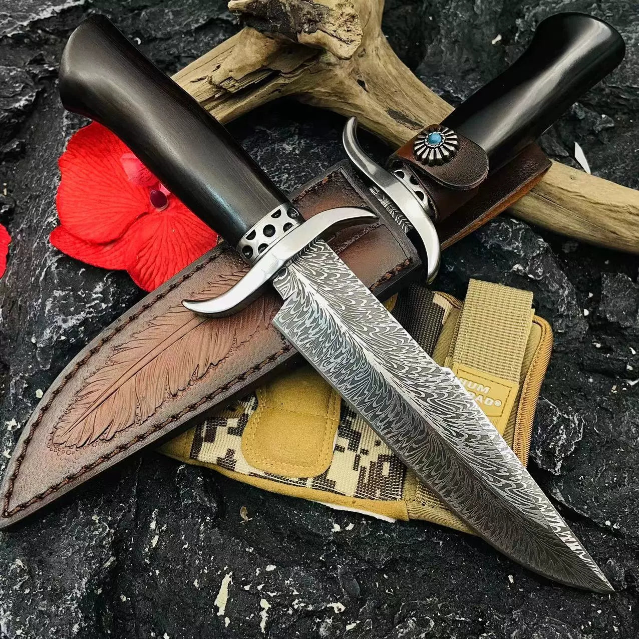BLAIR is constructed from 9Cr15Mov stainless steel and features a unique feather pattern on the blade. Designed with an ergonomic black ebony handle and stainless steel head, this knife offers superior power and precision for all cutting and felling tasks. Complete with a high-grade, genuine cowhide sheath, it is a practical and collectible survival tool.