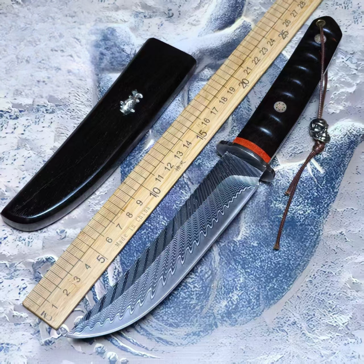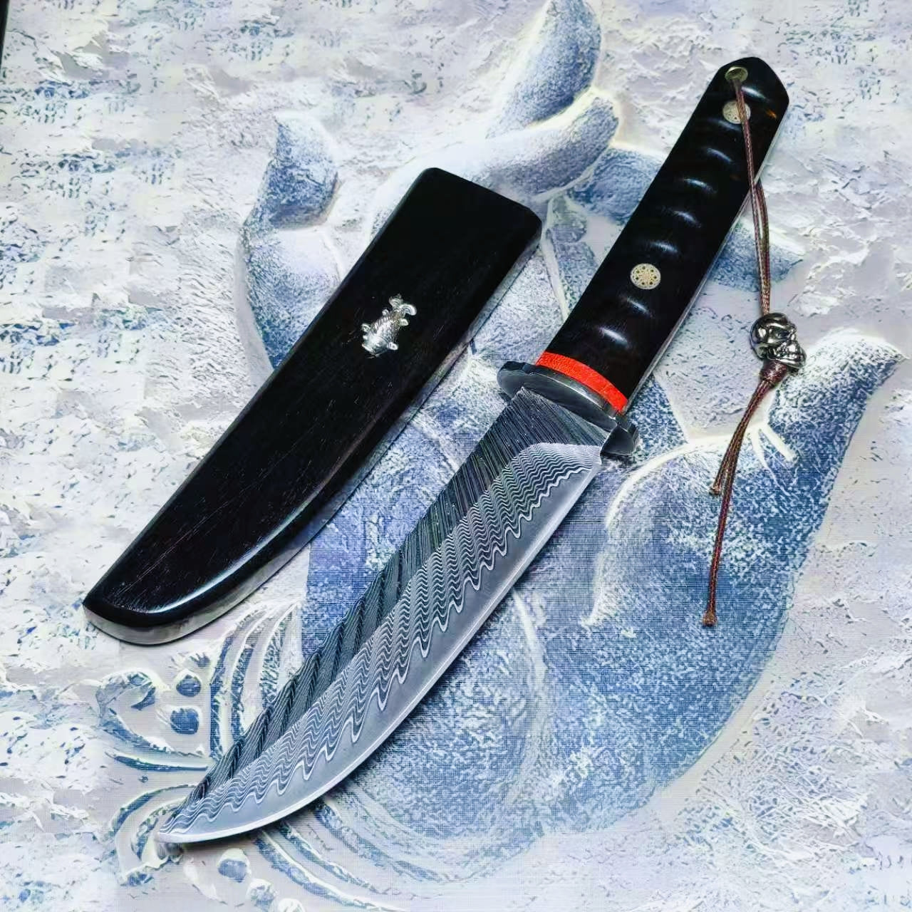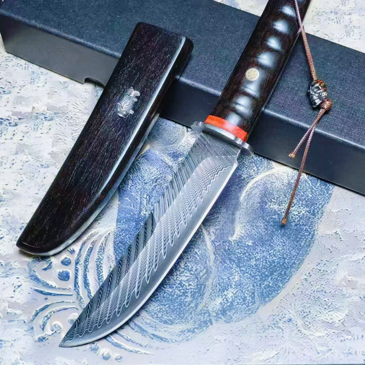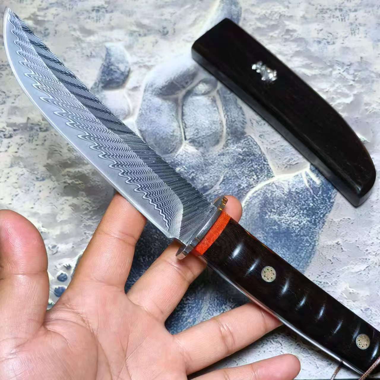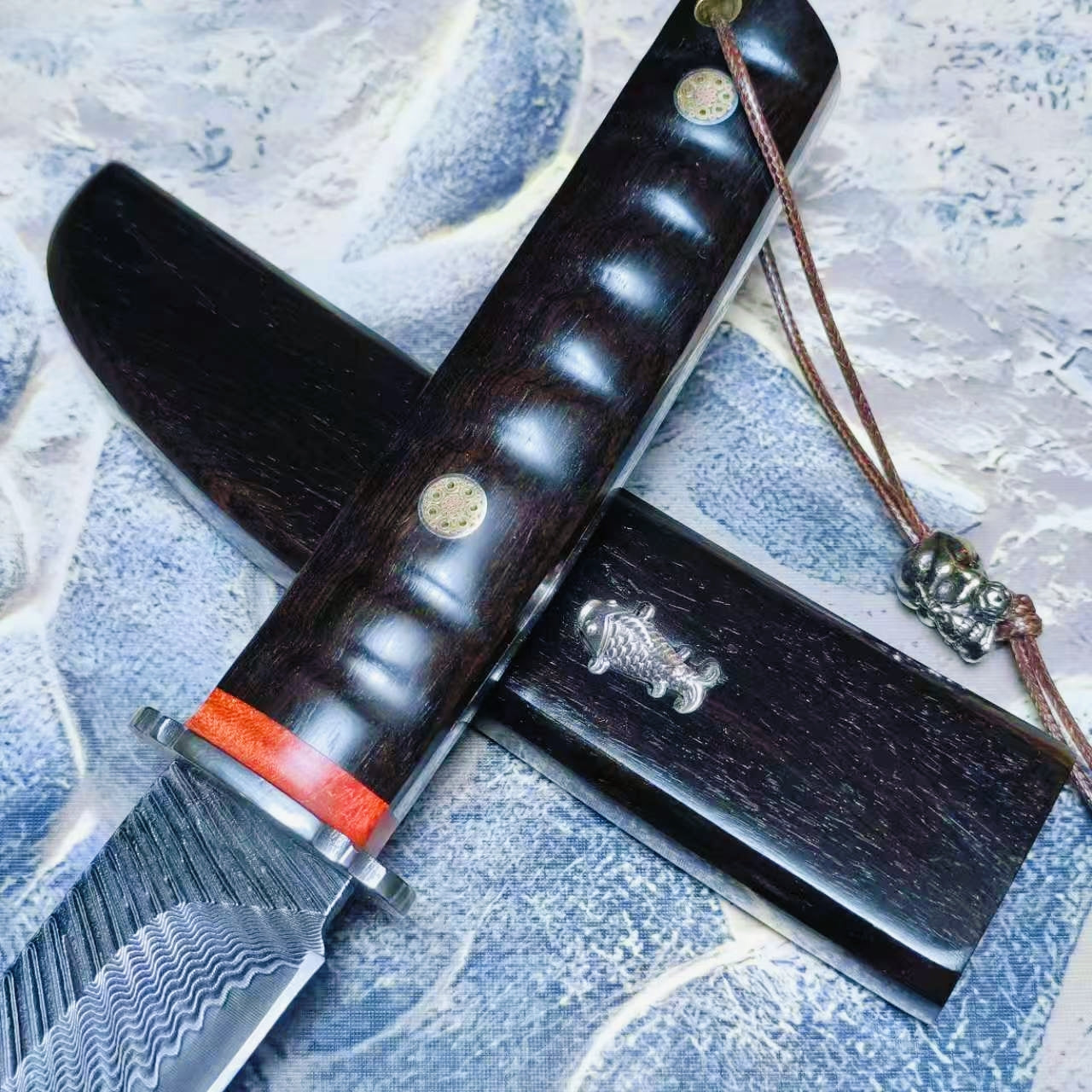 Channel your inner samurai with the ALONSO knife! Hand-forged using ancient methods and built with full-tang technology for flawless balance, this knife features 67 layers of VG10 Damascus steel adorned with stunning water ripple patterns. Its 62 HRC hardness lets you slice through anything like butter. The textured ebony handle and matching scabbard offer a grip worthy of a ninja, empowering you to chop, dice, and julienne like a kitchen superhero. Say farewell to dull blades and welcome your new culinary champion!