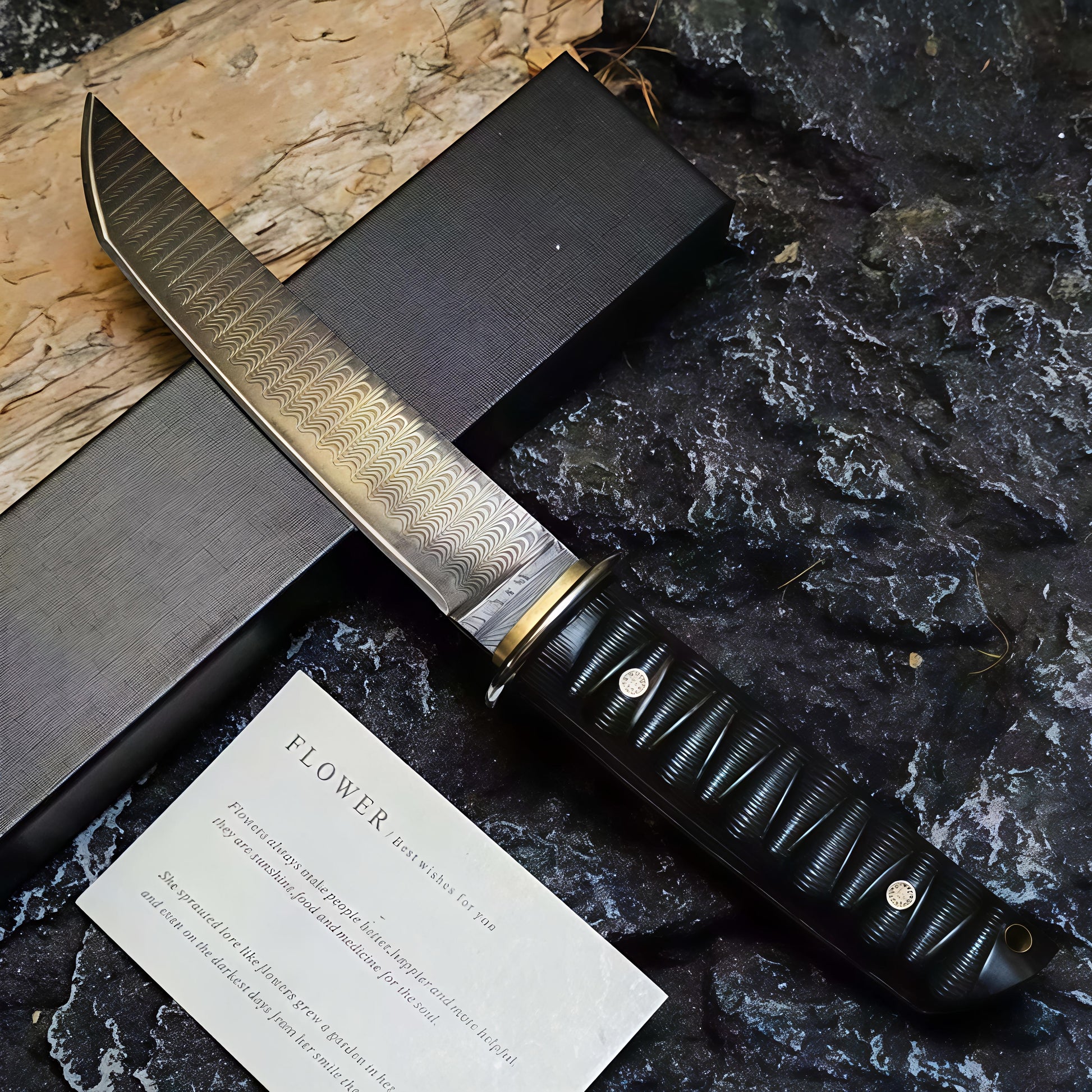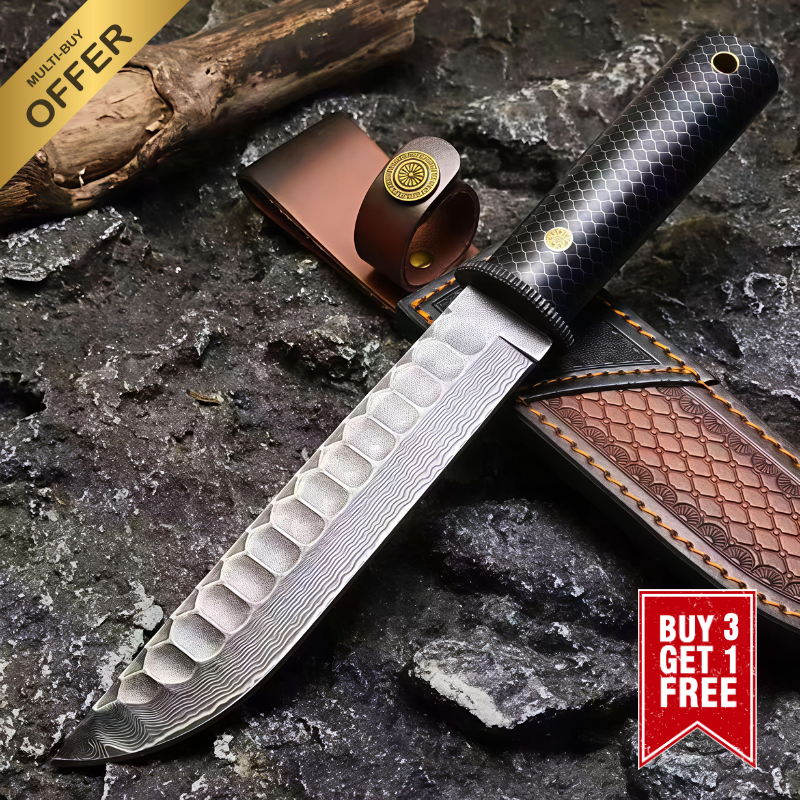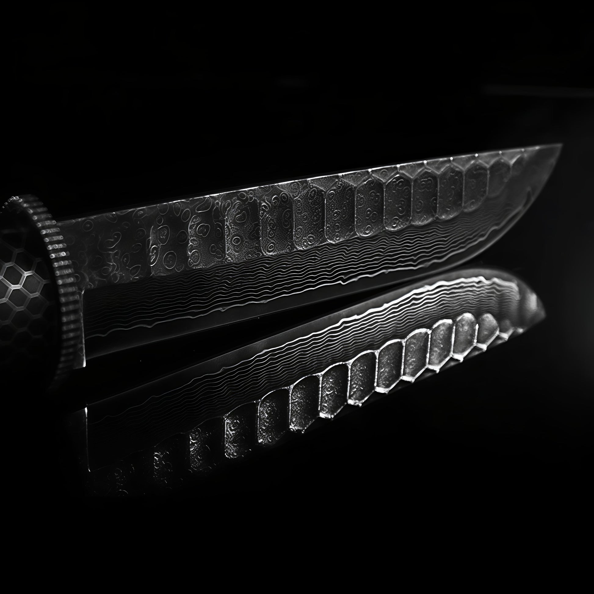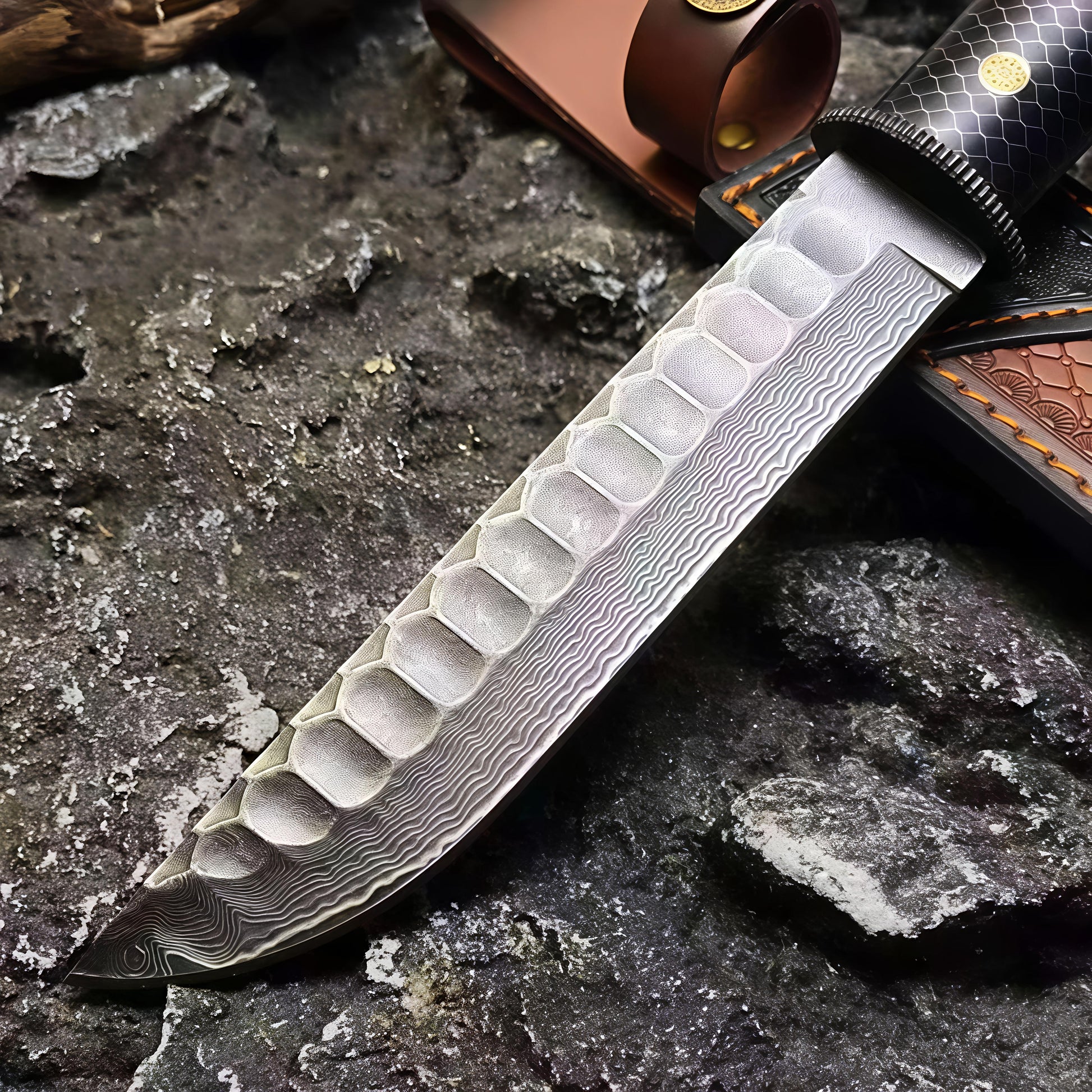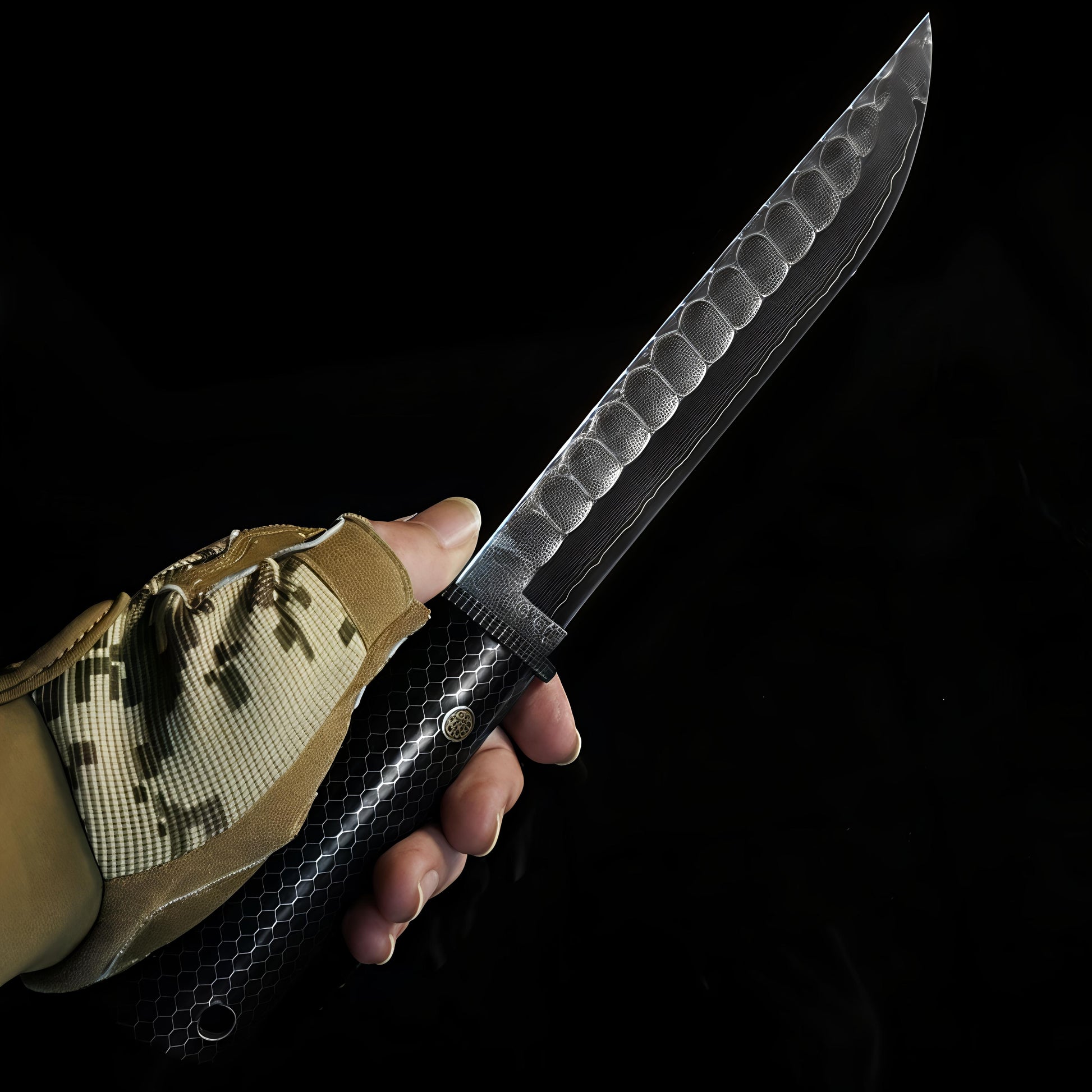 The AMOS is built for those who refuse to settle. Forged in Damascus VG10 steel with a hand-hammered concave blade, this knife dominates every cut. Carbonized blackening and cold-water sharpening technology eliminate meat stick—pure efficiency with every stroke. Full-tang construction paired with a resin and aluminum film handle delivers unwavering control in the most brutal conditions.From breaking down game in harsh conditions to executing surgical kitchen cuts, the AMOS is pure performance: a blade that refuses to quit, engineered for those who won't either.