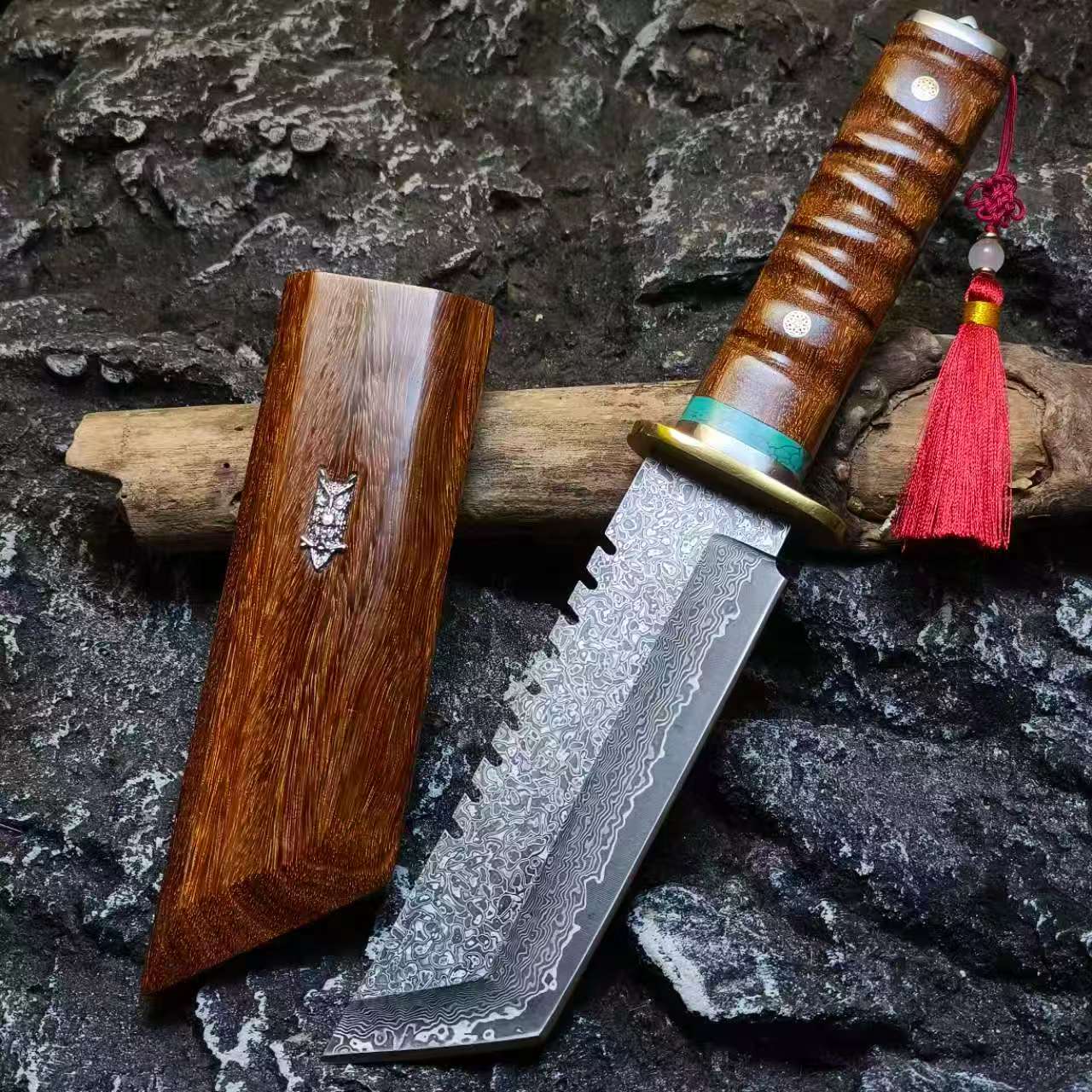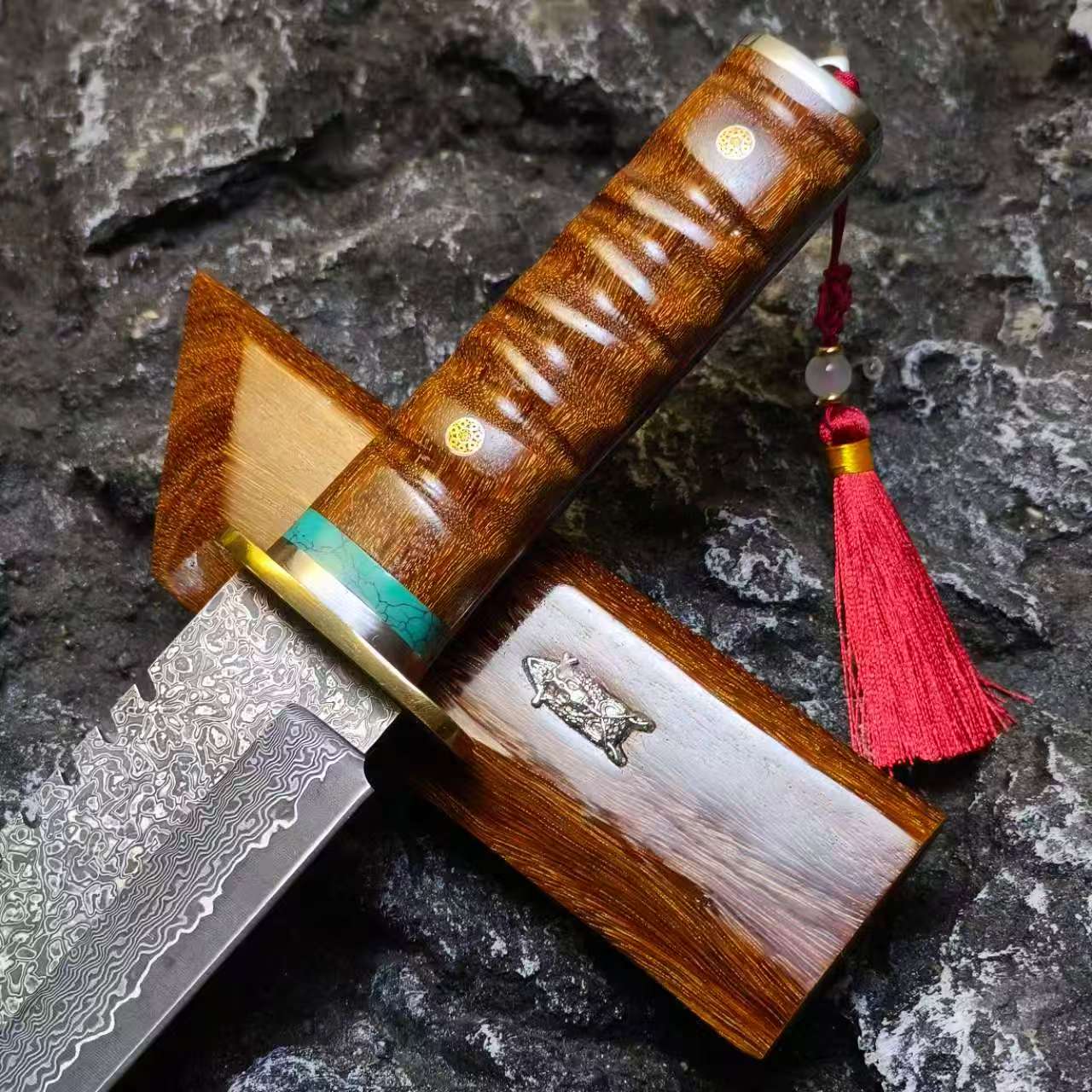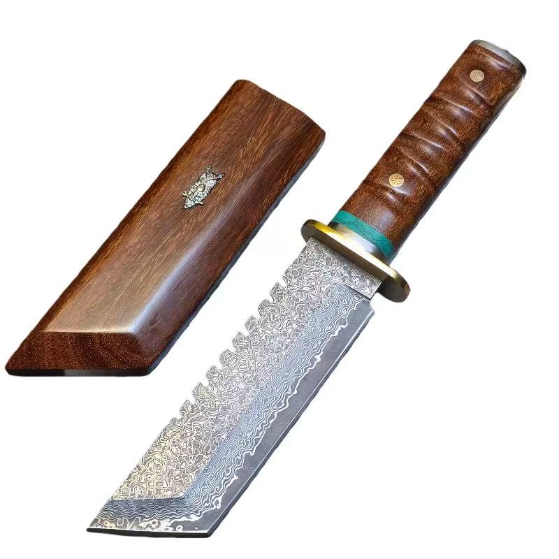 ARMIN merges wilderness mastery with culinary excellence. This full-tang beast features a VG10 Damascus blade—4cm wide with a fearless 61° pointed cleaver geometry that slices through branches, vines, and bone with surgical precision. Hand-carved Rosewood handle and scabbard showcase mesmerizing grain patterns, delivering an unshakeable grip when it matters most. Raw power wrapped in refined aesthetics—a knife that refuses to compromise between beauty and brutal performance.