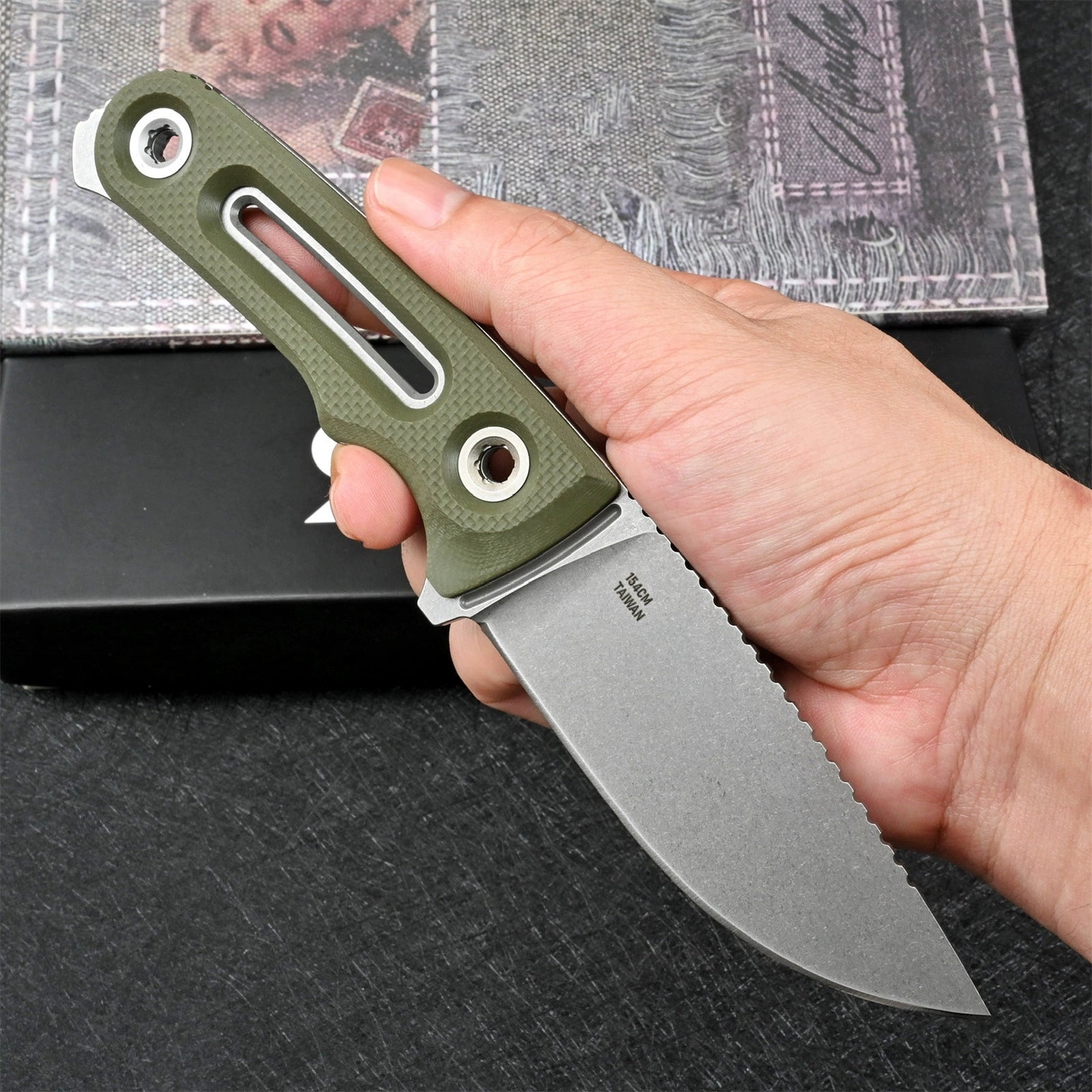 âThe blade is made of 154CM tool steel (60HRC), and the 420J2 powder black coating makes the blade gorgeous and hard, ensuring durability and performance when you need it most.