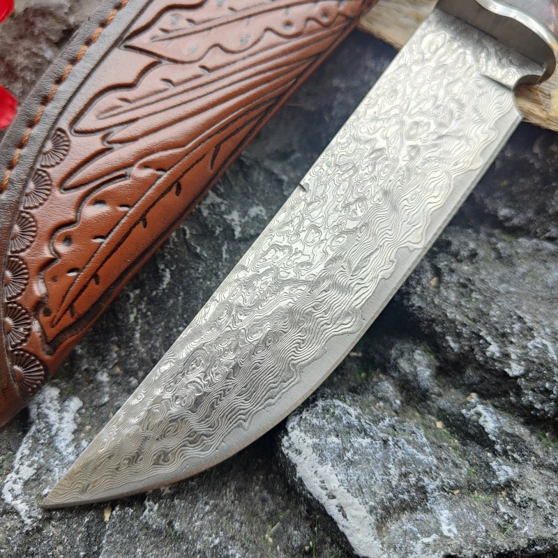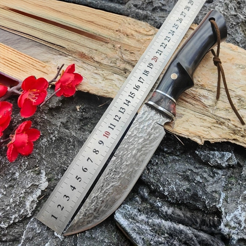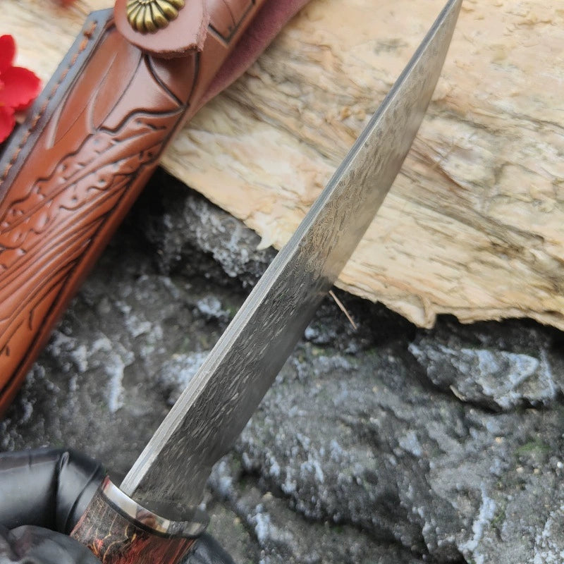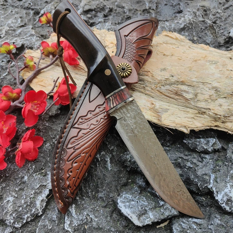đ„WALKER is a high-quality camping knife perfect for outdoor adventures. Its retro design and full-tang structure provide strength and versatility. Choose from two versions of SKD-11 or VG10 Damascus steel, both with a traditional tip. The non-slip ebony handle and custom textured leather shell make this knife both functional and collectible.